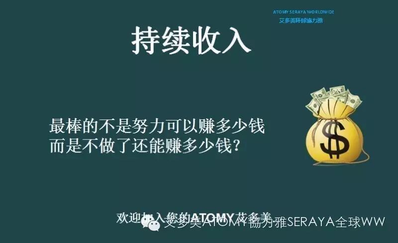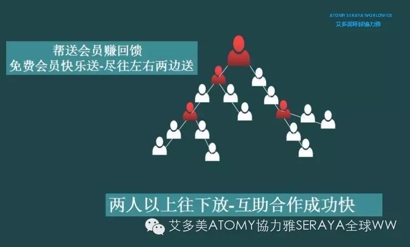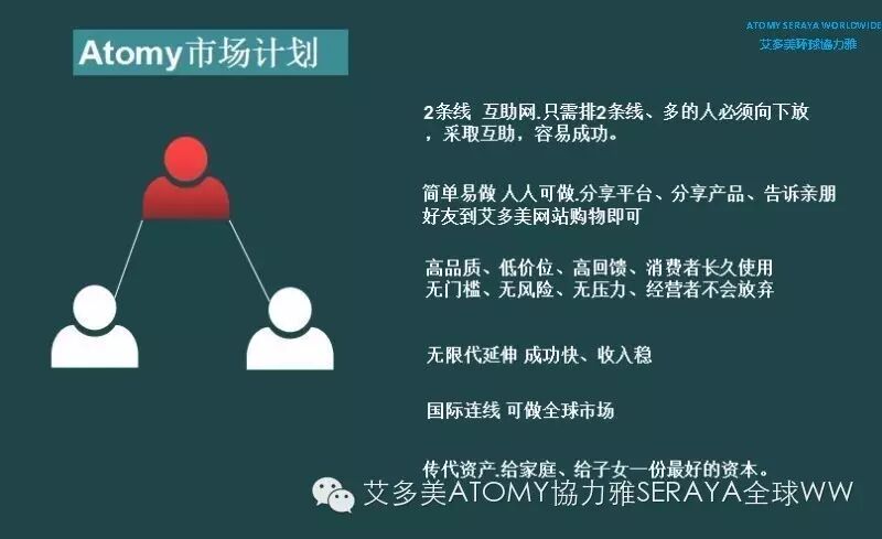 而且如果您觉得atomy的产品不错,且成功分享两位朋友使用,他们也各分享两位朋友,这样持续下去。您就可以根据左右两线的发展,而获得利润。