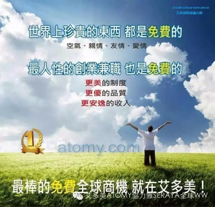 假如您喜爱使用好产品,同时也乐于分享使用感受,那么这就是您翻身的机会,因为atomy将提供給您最好的产品,以及最棒的分紅机会,因为使用以及分享atomy的好产品,就可以为自己带來无穷的财富与机会。